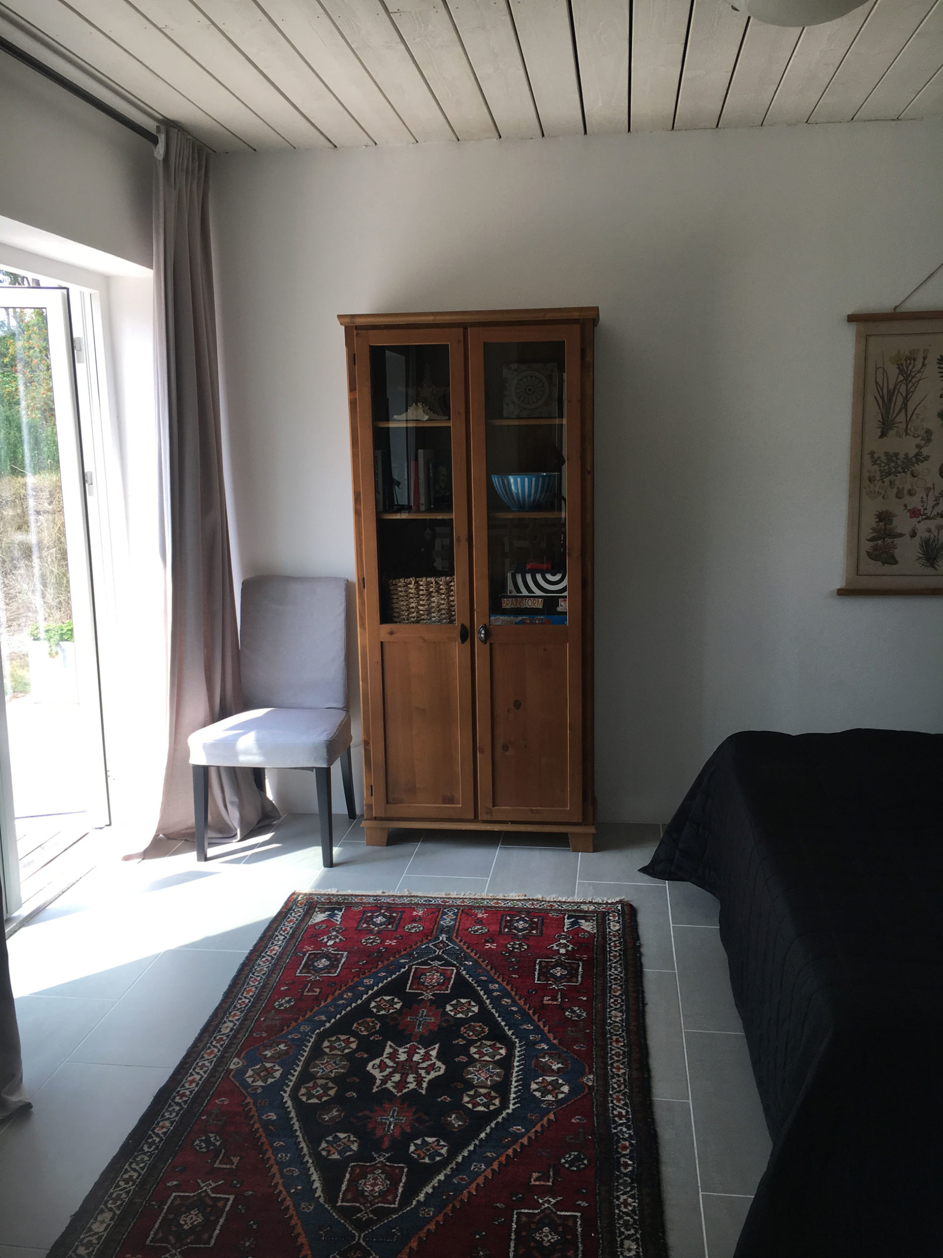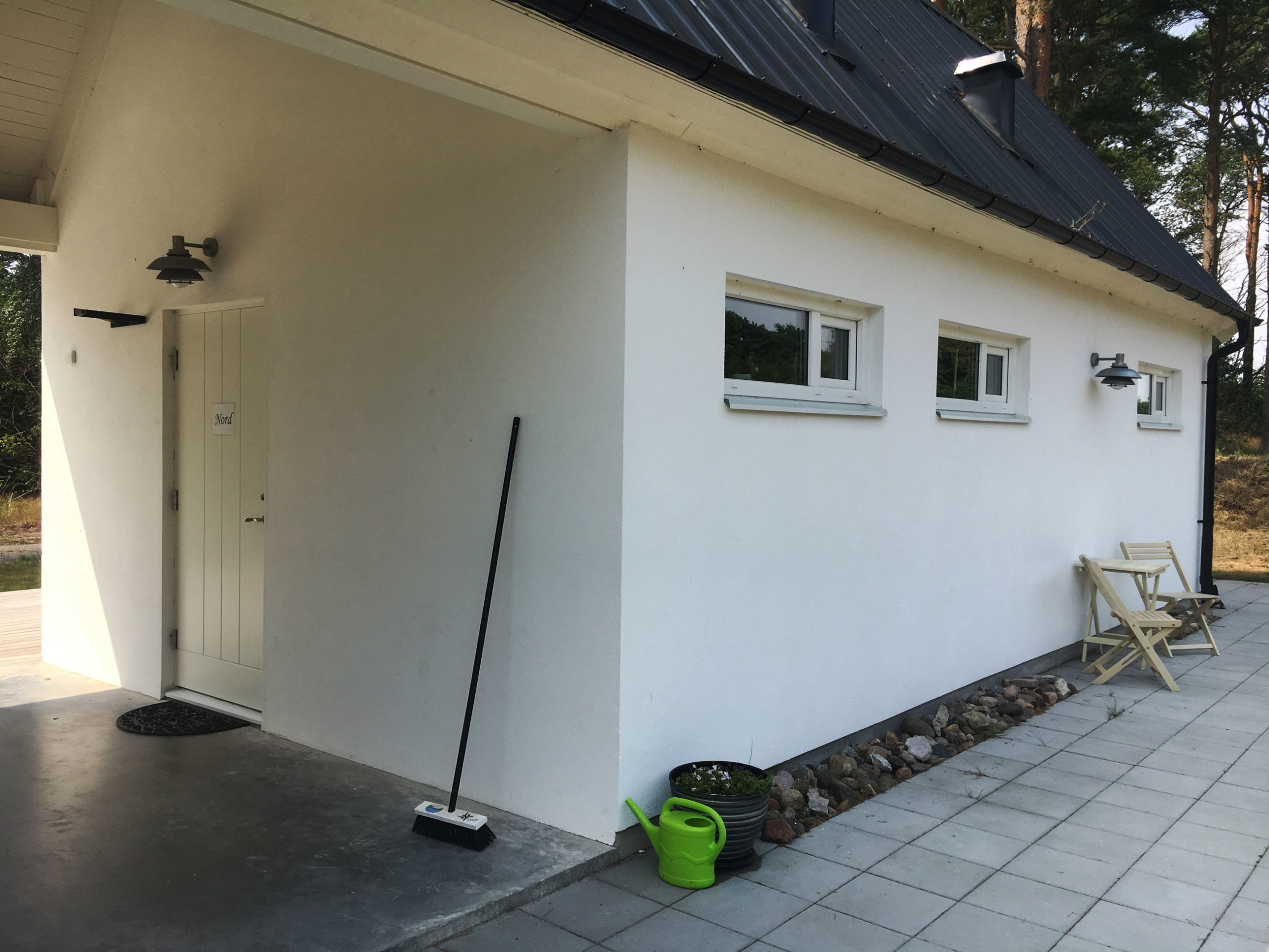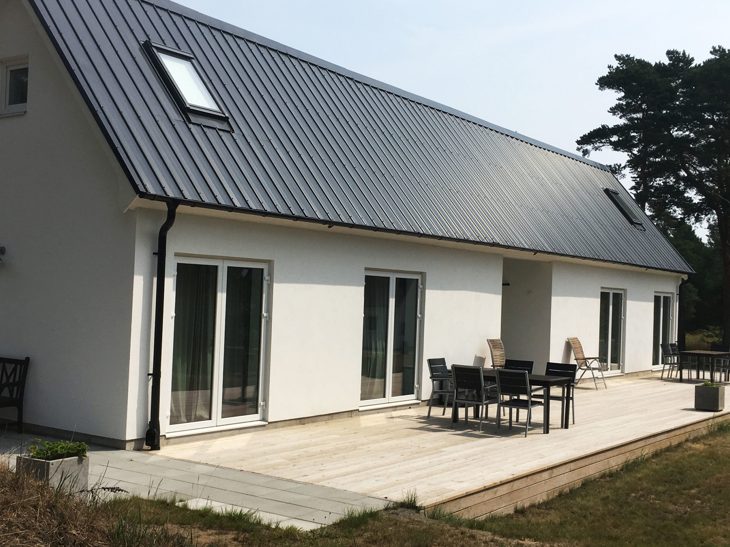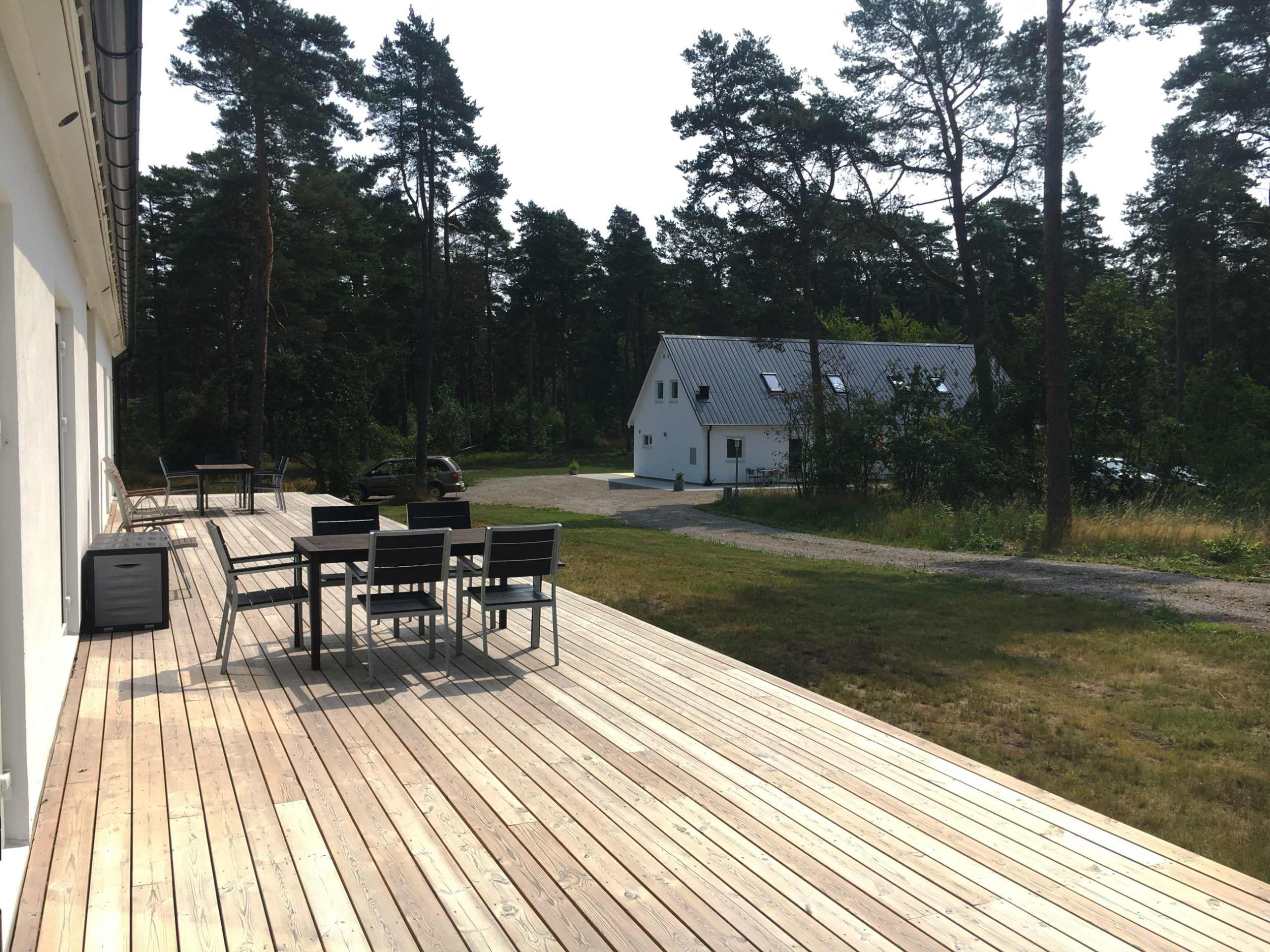 Du kan gå direkt ut till det fina trädäcket genom de båda glasdörrarna och sätta dig i kvällssolen. Vill du ta morgonfikat i solen går du ut på framsidan och sätter dig och njuter.